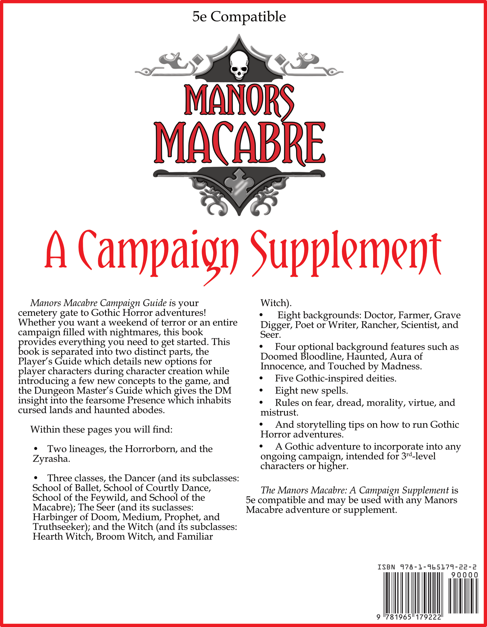 Manors Macabre: A Campaign Supplement is your cemetery gate to Gothic Horror adventures! Whether you want a weekend of terror or an entire campaign filled with nightmares, this book provides everything you need to get started. This book is separated into two distinct parts: the Player’s Guide, which details new options for player characters during character creation while introducing a few new concepts to the game, and the Dungeon Master’s Guide, which gives the DM insight into the fearsome Presence that inhabits cursed lands and haunted abodes.