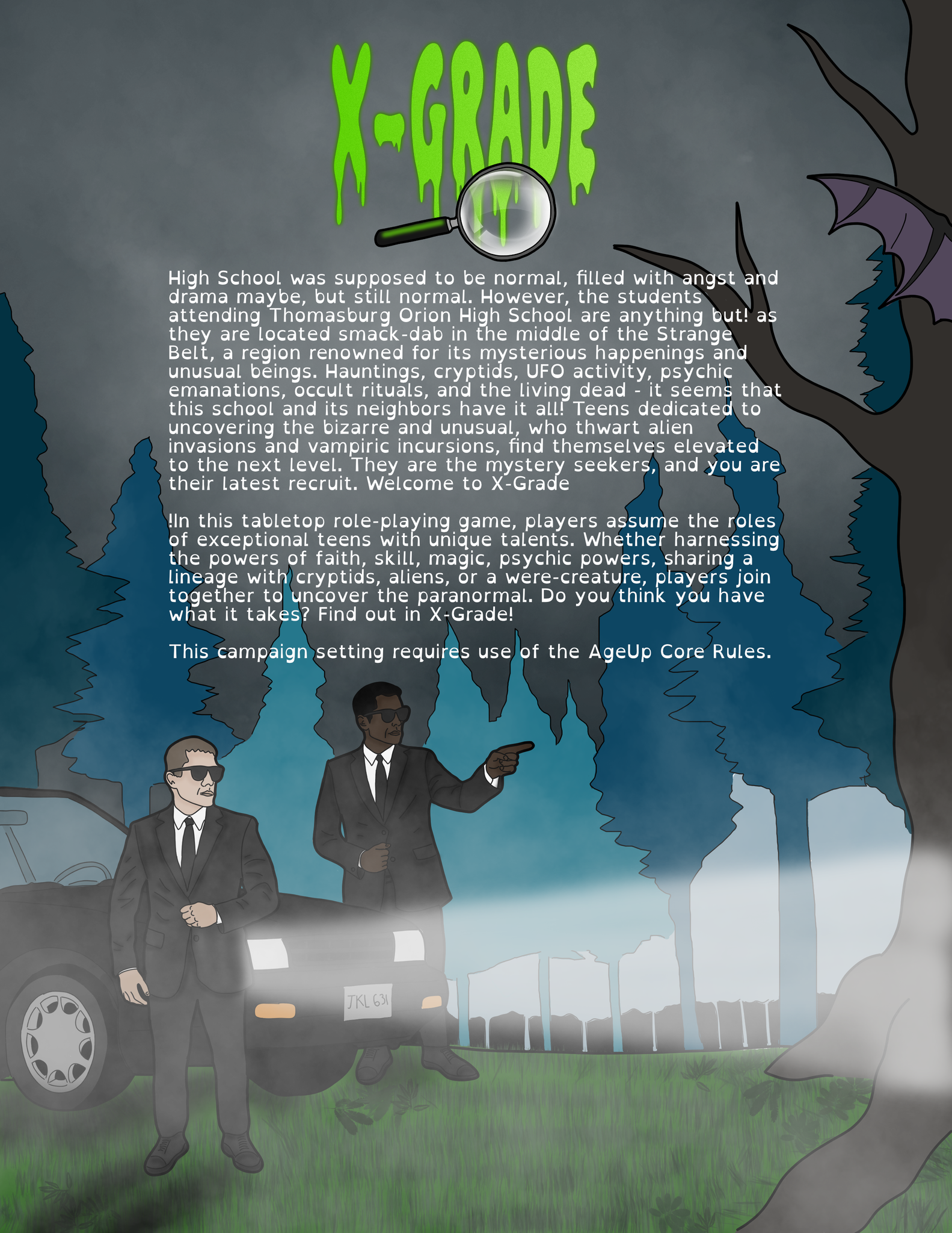 High School was supposed to be normal, filled with angst and drama maybe, but still normal. However, the students attending Thomasburg Orion High School are anything but! as they are located smack-dab in the middle of the Strange Belt, a region renowned for its mysterious happenings and unusual beings. Hauntings, cryptids, UFO activity, psychic emanations, occult rituals, and the living dead - it seems that this school and its neighbors have it all! Teens dedicate to uncovering the bizarre and unusual, who thwart alien invasions and vampiric incursions, find themselves elevated to the next level. They are the mystery seekers, and you are their latest recruit. Welcome to X-Grade!